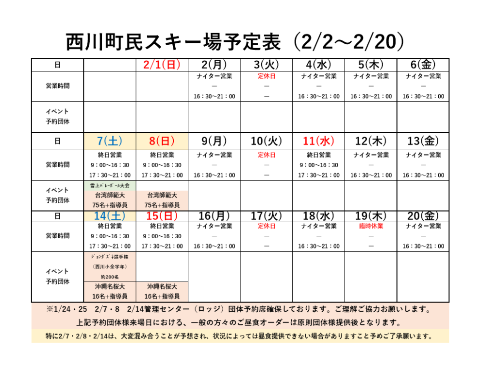 お知らせ・イベント2026/2/2西川町民スキー場 全ゲレンデ滑走OK